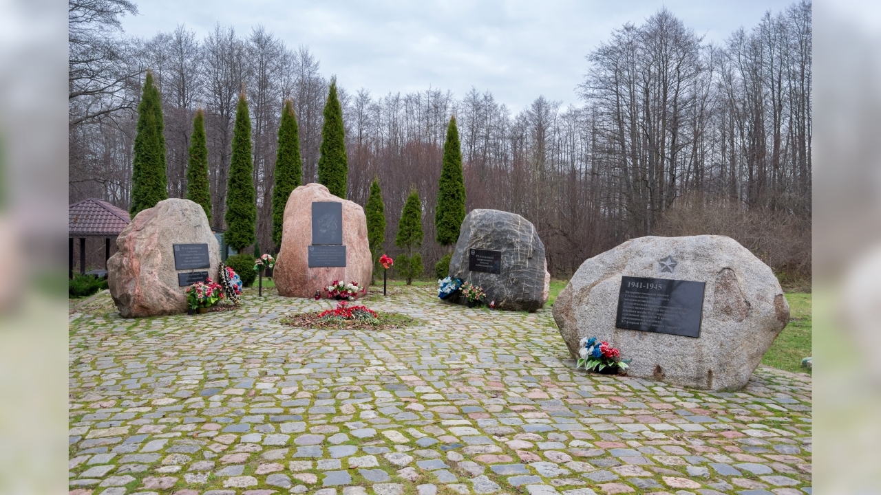 На вымощенной булыжником площадке установлены четыре валуна с памятными досками, перед которыми разбита клумба в форме звезды.
