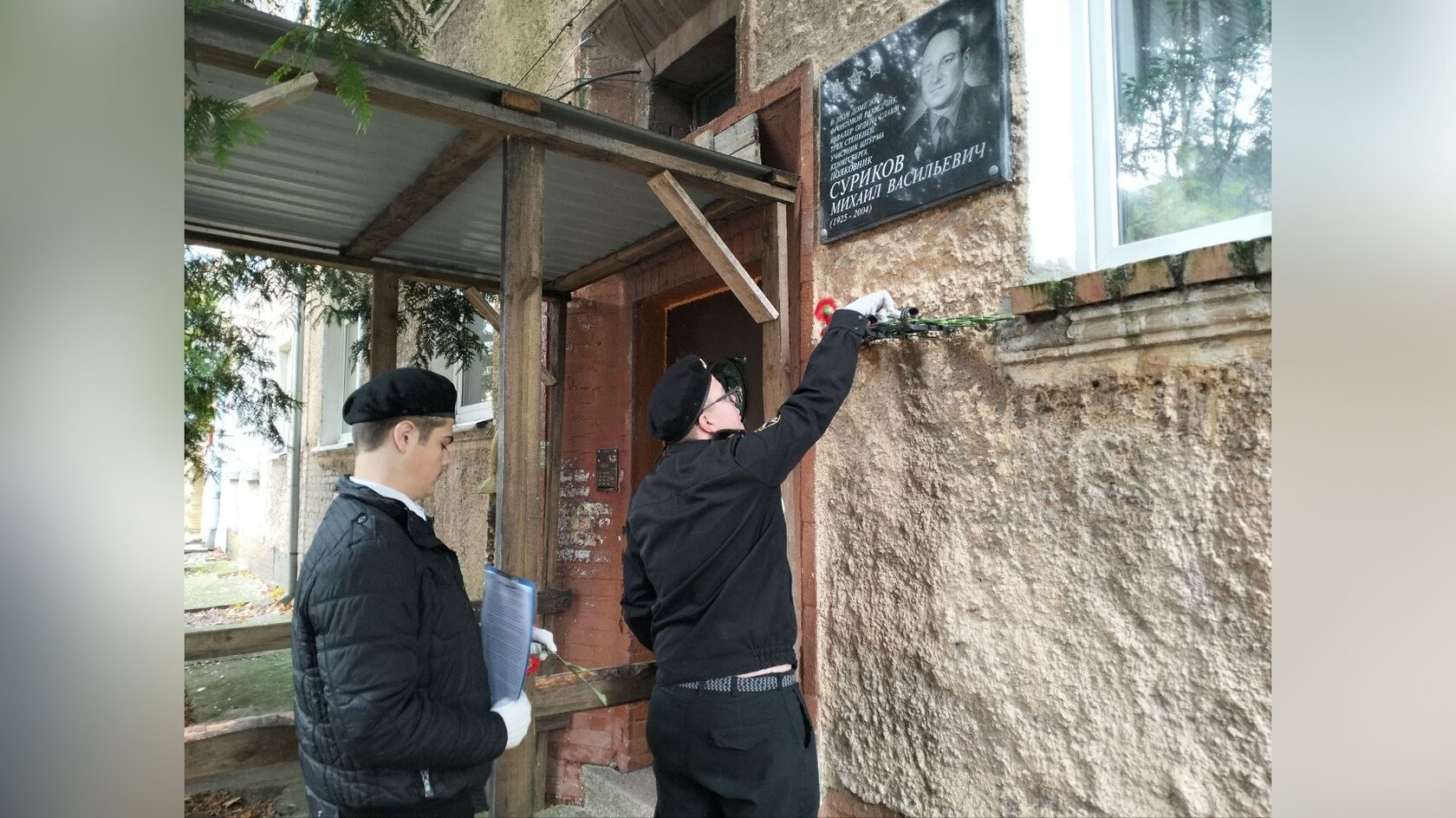 5 ноября 9 кадетский класс п. Кострово возложил цветы у мемориальной доски, установленной Михаилу Васильевичу Сурикову, полному кавалеру ордена Славы, участнику штурма Кенигсберга.